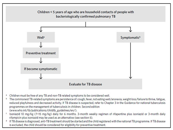 - HIV-negative children aged < 5 years (< 6 years in India) who are household contacts of people with bacteriologically confirmed pulmonary TB
